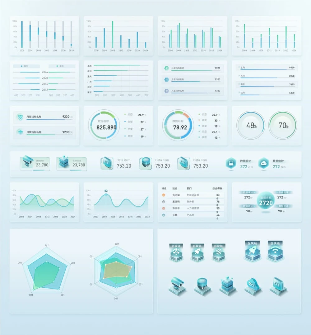 大数据城市中心驾驶舱 浅色 绿色 图表 折线图 饼图 立体图表 可视化大屏 figma格式